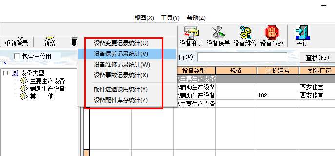 9、这里是设备统计的功能,支持设备事故记录统计、配件进退领用统计、设备配件库存统计