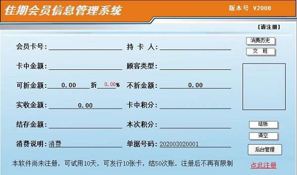 佳期会员消费一卡通官方版是一款会员消费管理软件。佳期会员消费一卡通官方版包含了会员售卡、会员修改、会员存款、会员退卡、批量售卡、消费统计、消费历史、奖励积分、扣减积分、会员查找、财务管理以及权限设置等主要功能。佳期会员消费一卡通可以随时备份系统中的数据。