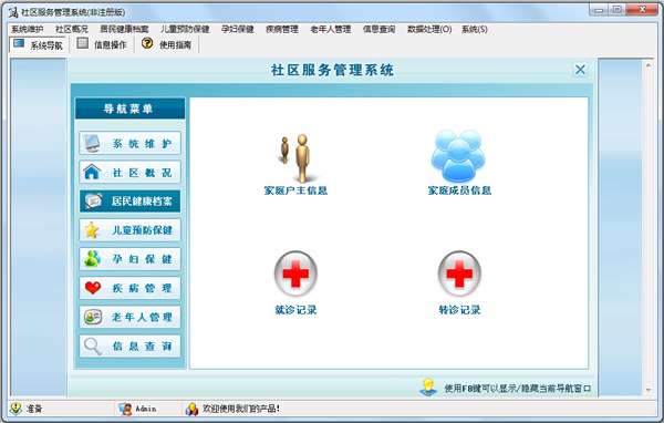 社区服务管理系统是一款为社区卫生服务站、诊所等场合设计的服务管理软件,可以进行社区状况、居民健康档案、儿童预防保健、孕妇保健、疾病管理、老年人健康档案、老年人健康的跟踪及各模块的信息查询等功能的操作。