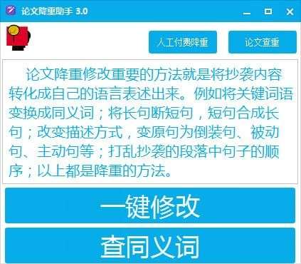 论文降重助手官方版是一款实用的论文修改软件。用户使用论文降重助手最新版可以一键修改论文重复的句子,还有文中的表述方式,有效的达到降重的目的,还可以快速的帮你查找到同义词,节省您的精力和时间。论文降重助手官方版支持通过复制论文段落完成修改,也支持对意思相同的句子修改。