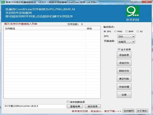 奈末CDR格式批量转换助手中文版是一款便捷实用的CDR格式转换软件,奈末CDR格式批量转换助手官方版主要方便用户将coreldraw保存的CDR文件转换为jpg、png、ai等格式,奈末CDR格式批量转换助手中文版支持CorelDraw批量转JPG、CorelDraw批量转PNG、CorelDraw批量转AI等功能。