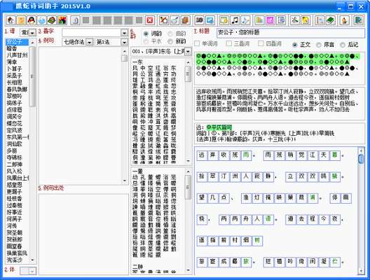 鹰蛇诗词助手最新版是一款简单便捷的写诗词工具软件,鹰蛇诗词助手官方版内含大量丰富的知名诗词,能够为用户提供写诗参考,用户还可以进行搜索关键词、同谱查询、自定义谱、分数图形等操作,鹰蛇诗词助手最新版拥有诗词格律检测功能,包括标记平仄、押韵、是否失黏等。