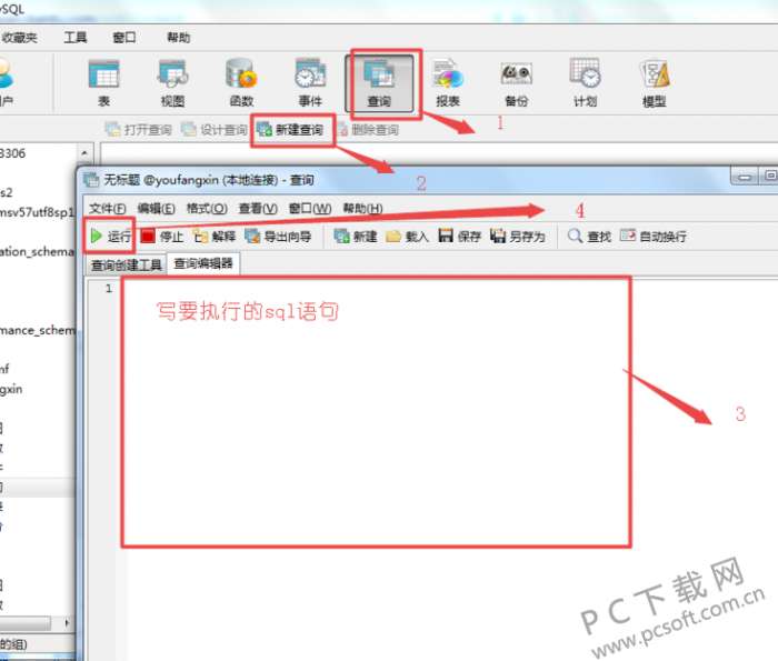 3、如果您要执行sql语句的话,点击Navicat for MySQL上面的【查询】,选择【新建查询】,然后在打开的窗口中写入要执行的sql语句,写入完成后点击左上角的【运行】就可以看到执行的sql语句的结果了。