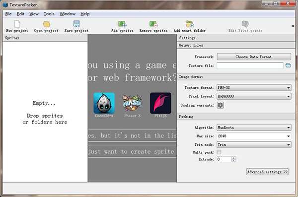 TexturePacke最新版是一款功能强大的图片打包工具,TexturePacke官方版能够帮助用户快速分类打包各种图片文件,软件支持多种图片格式,且打包之后不会对图片的质量造成损伤,TexturePacke最新版可以直接导入PSD、SWF、PNG、BMP等常见的图片格式,主要用于网页、游戏和动画的制作。