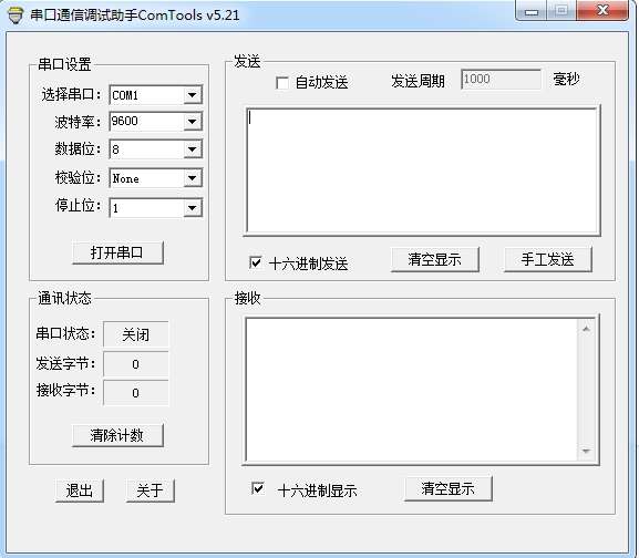ComTools串口通信调试助手的界面还是蛮简洁直观的,分别是串口设置、通讯状态、发送窗口和接收窗口四个模块,要进行串口调试的话,首先得选择对应的串口,并保证设备已经连接好,然后,再点击【打开串口】来进行调试操作。