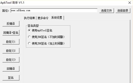 默认签名方式为“⊙使用apktool签名”,如果要使用jdk签名,可在“系统设置”选择“⊙使用jdk签名程序(不加时间戳)”或“⊙使用jdk签名程序(加上时间戳)”签名