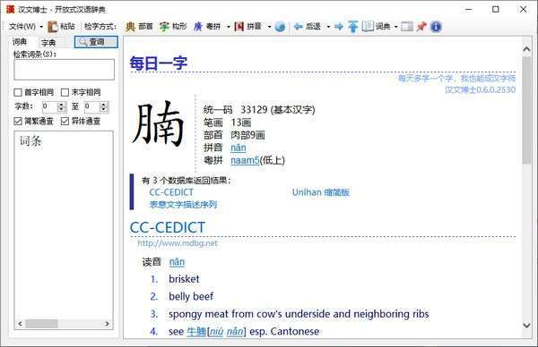 免费的电子词典、字典检索功能,有统一汉字(Unihan)14.0、异体字及构形数据库、汉字笔顺、康熙字典、说文解字、国语词典、CC汉英词典等三十多部字典和词典。