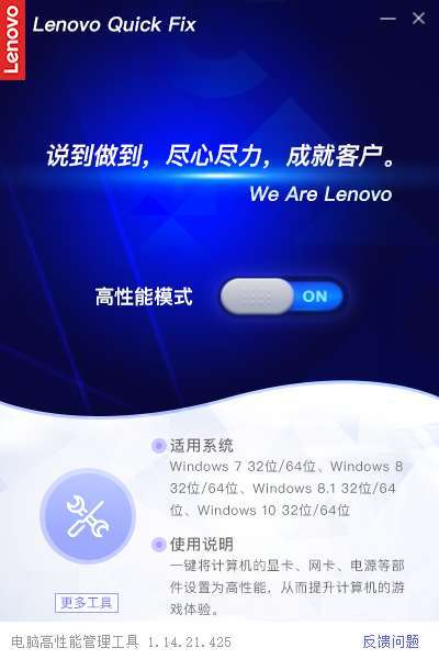 Lenovo Quick Fix电脑高性能管理工具是由联想官方推出的一款实用工具,开启高性能后会新增一个【高性能】电源方案,一键将计算机的显卡、网卡、电源等部件设置为高性能,从而提升计算机的游戏体验。