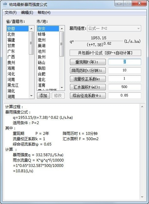 佑鸣最新暴雨强度公式软件正式版是款高效专业且功能相当强劲实用的暴雨强度公式计算工具,佑鸣最新暴雨强度公式软件正式版采用的最新的技术,其软件是为了汇集国内所有的、最新的省市区县暴雨强度公式而研发设计的。佑鸣最新暴雨强度公式软件为用户提供了1000多条暴雨强度公式,且收集核对如此众多的数据是一项繁重精细的工作,非常的方便实用。