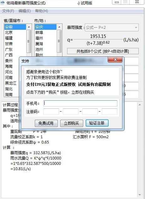 1、打开2019最新暴雨强度公式 Ver1.02.exe,20元就可以购买软件,可以预先试用