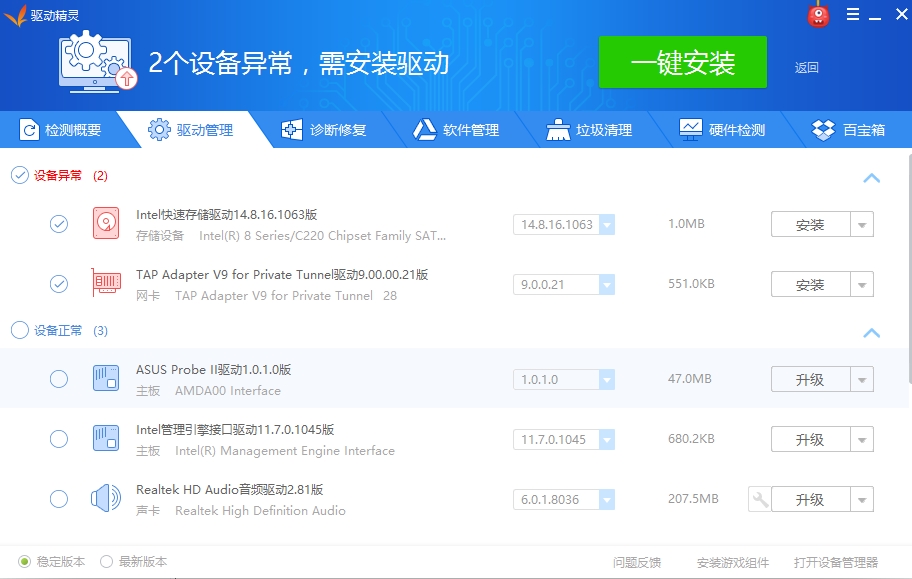 3、驱动精灵检测完成后,您就可以看到驱动管理选项中哪些驱动需要更新,哪些驱动有异常,您都可以看到,您可以自行选择是否升级或修复驱动。