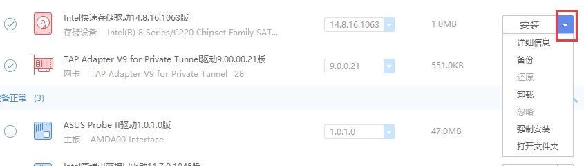 5、如果您想备份驱动,您可以点击【▼】选项,选择【备份】选项就可以了。或者您还可以选择其他选项如:详细信息,卸载等,您可以自行选择。