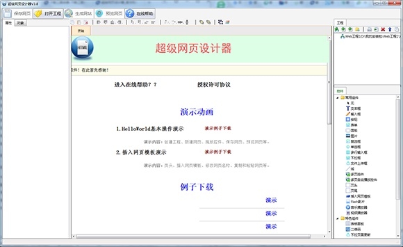 超级网页设计器官方版是一款专业且高效的网页开发制作和设计工具。超级网页设计器官方内置文本框、输入框、按钮、表单、面板、多行输入框、多页控件、文件上传框、插入网页模板并为用户提供可视化的网页编辑与设计窗口。超级网页设计器最新版功能强悍让用户无需太多的专业知识就能设计出精美绝伦的网页。