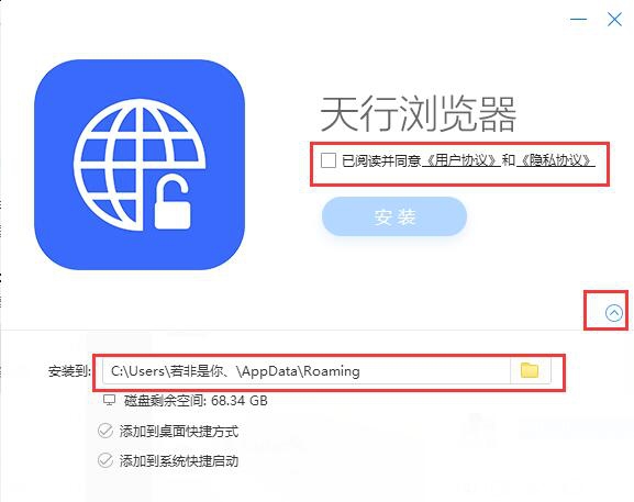 2.选择天行浏览器软件的安装位置,然后勾选我同意使用协议后点击安装。