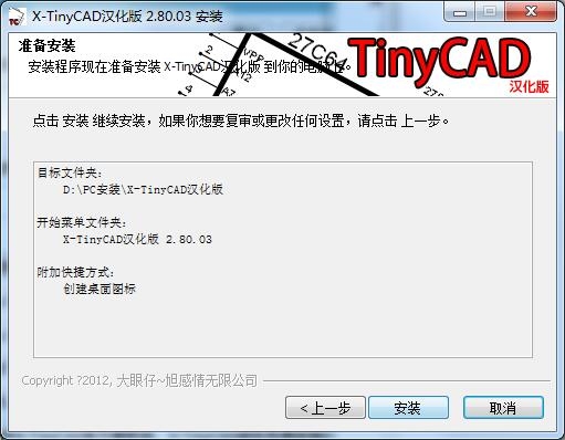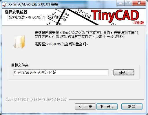 3、选择tinycad汉化版想要的路径C:Program Files (x86)X-TinyCAD汉化版,选择完成后点击确定