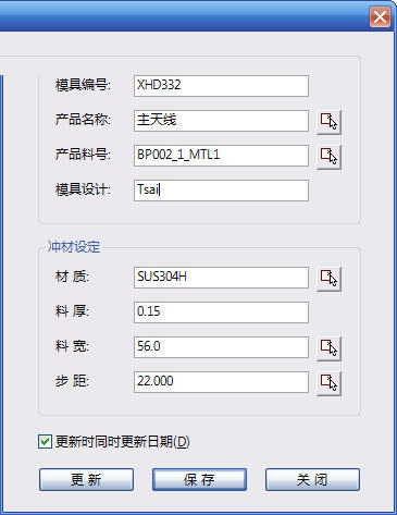 输入完成后,点"保存"->"关闭",这样会自动填写此处的资料至后续插入的图框、模板材料规格表、标准件清单及模具标签中。
