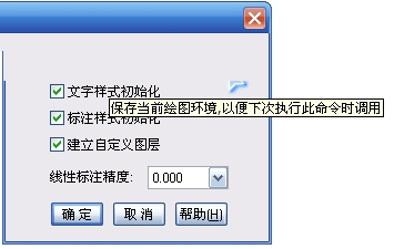 "绘图环境初始化"用于设置当前CAD环境,包括设置常用变量、新建文字样式、新建标注样式、建立用户自定义图层。