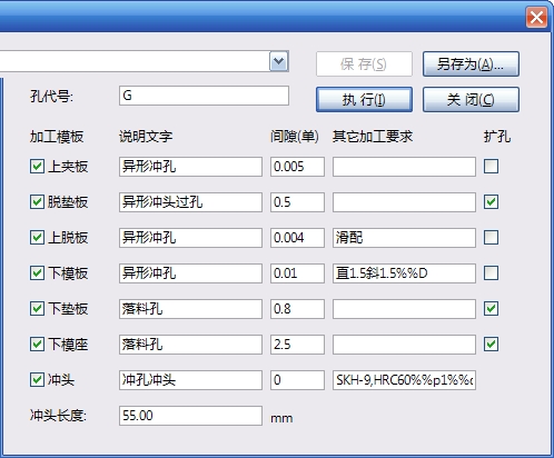 如果哪一块模板的间隙需调用"模板设置与绘制"中的"冲裁间隙"处的数值,请填入"C"再按"保存"按钮,重新执行此命令即可。
