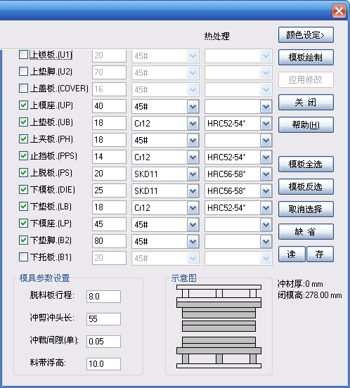 在需要绘制的模板名称前打"√",然后输入各模板的厚度,并选择材质及热处理。