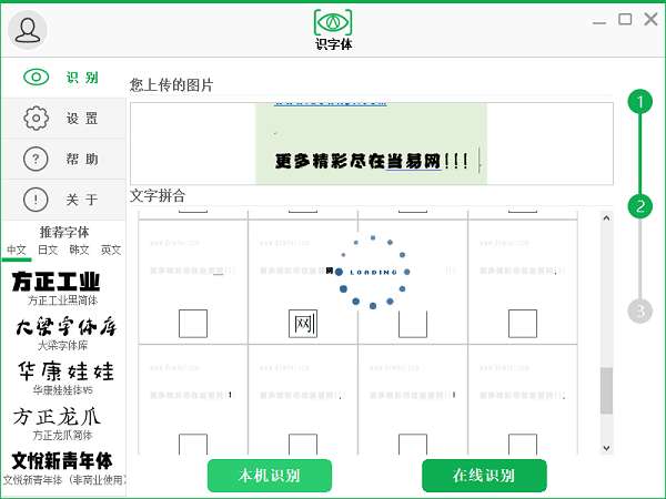 识字体软件是全球首款图片识别字体软件,由字客网独立研发,界面简约清新,操作简单,支持多种字体,轻松一步就能搞定字体识别。有需要的朋友快来试用吧!