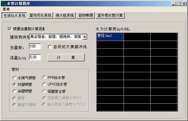 水管计算程序官方版是款针对水管所打造的计算工具。水管计算程序电脑版要作用是用来进行生活给水系统(要选择建筑物类别)、室内污水系统、消火栓系统、自动喷洒、室外雨水管等的计算。水管计算程序体积小,界面美观、大方,操作便捷,容易上手,是从事家庭装修行业人员的好帮手。