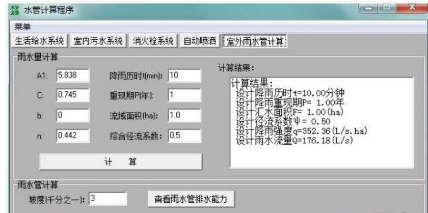 雨水量计算(降雨历时、重现期、流域面积、综合径流系数)、雨水管计算(坡度)