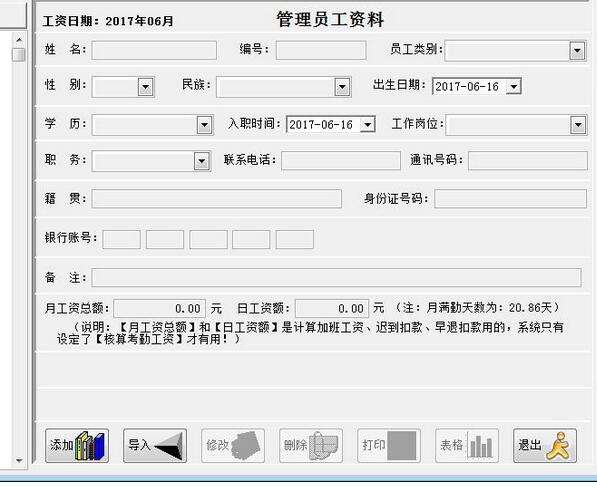 4、添加员工界面包括了员工资料列式、工资日期、管理员资料、姓别、编号、员工类别、身份证号码、备注、月工资总额等;