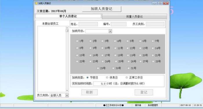 9、加班资料管理包括了本期全部员工、加班月份、公园类别、加班类型、正常工作日、实际加班时间数等;