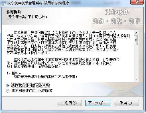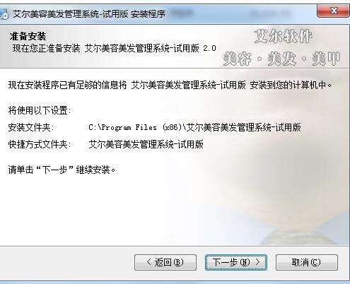 5、选择软件安装路径,这里默认选择C:Program Files (x86)艾尔美容美发管理系统-试用版,点击下一步。
