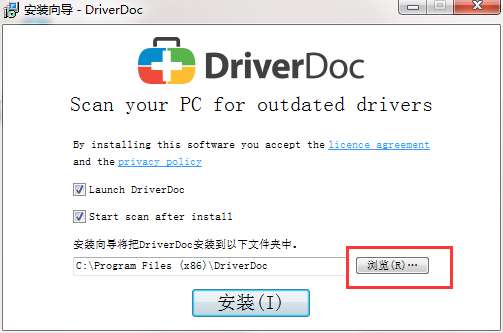 1、在PC下载网下载DriverDoc最新版这款软件的压缩包,解压后,双击exe文件,进入安装界面,点击浏览可以自由设置软件的安装位置,建议大家选择安装在D盘