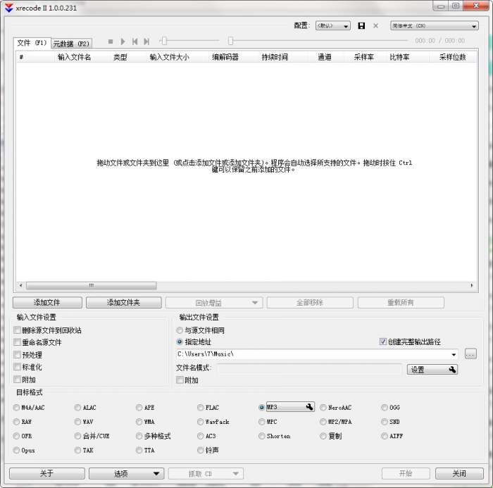 XRECODE II支持音频格式转换和音频抓取,支持转换几乎所有的音频格式:mp3, mp2, wma, aiff, amr, ogg, flac, ape, cue, ac3, wv, mpc, mid, cue ,tta, tak, wav, wav(rf64), dts, m4a, m4b, mp4, ra, rm, aac, avi, mpg, vob, mkv, mka, flv, swf, mov, ofr, wmv, divx, m4v, spx, 3gp, 3g2, m2v, m4v, ts, m2ts, adts, shn, tak, xm, mod, s3m, it, mtm, umx, mlp to m4a, alac, ape, flac, mp3, mp4 (using NeroAAC), ogg, raw, wav, wav(rf64), wma, WavPack, mpc, mp2, Speex, ofr, ac3, aiff, tak, snd以及Shorten格式。甚至支持命令符参数的操作,不愧是是全能型的转换工具。与旧版不同的是,新版加入了中文界面,相对于英语较差的朋友来说,是件福利。
