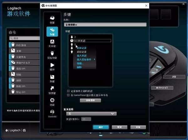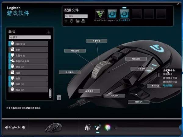 在这个自定义鼠标按键功能页面里,主要分为三个功能区,一个是左边“命令”区,你可以单独为每一个鼠标按键指定单独的操作(也就是可以脱离游戏以外来自定义鼠标按键了),然后是右上方的“配置文件”,这里你可以单独为每一个游戏指定一个配置方案,包括自定义的鼠标按键和宏操作。当然了,如果每一个游戏都要自定义就超级麻烦,于是在这里你也可以单击搜索或者下面的+号,就会自动列出一些常见的游戏按键组合(都是参考大神制定的),像是LOL,CSGO之类的,就不需要自己一个一个去设置了。最后要说的当然就是文本的重点,自定义鼠标宏操作。这里,你可于图片中右边鼠标那里选中其中一个功能按键,然后点鼠标右键,就会呼出一个子菜单
