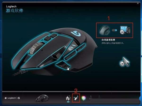 注意,第一次打开罗技游戏软件控制面板的时候,窗口中右上角1处是默认选择“板载内存-使用鼠标上存储的配置文件”,你要手动把拉杆拖到右边,这时候才可以使用电脑来录制自定义的鼠标宏操作。现在,我们点击图片中方框2的按钮,进入罗技G系列游戏鼠标按键功能自定义菜单
