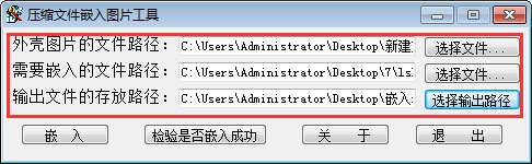 压缩文件嵌入图片工具是一款方便易用的压缩文件隐藏工具。该软件采用嵌入图片的方式,可以将压缩文件与图片合成为一体,合成后电脑上只显示图片,不会显示压缩文件,只有用压缩软件打开图片才会显示出压缩文件,主要用来隐藏一些加密的文件。