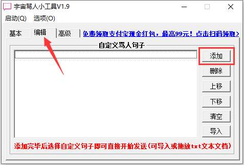 1、打开宇宙骂人小工具,切换到“编辑”页面后,点击“添加”可以自行设置发送的语句。