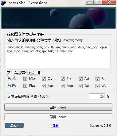 首次使用时,只需简单的点击一下 ‘激活 Icaros’. 它默认能够缩略MKV (10位的也支持) 和OGM 文件.它几乎支持所有的视频文件类型的缩略图,在它可选的视频文件类型中,简单添加一下,然后重新 ‘激活 Icaros’ 即可生效。