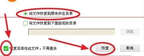 4、选择将文件恢复到原文件所在目录,并勾选恢复后信任此文件。点击恢复即可。