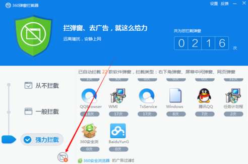 3:在“360弹窗拦截器”里点击“强力拦截”。“强力拦截”模式拦截效果更好。
