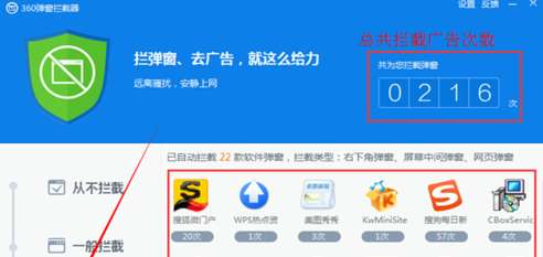 下图大的红色方框里的是小编已经设置拦截了弹窗广告的软件,小的红色方框可以看到总共拦截了多少次广告