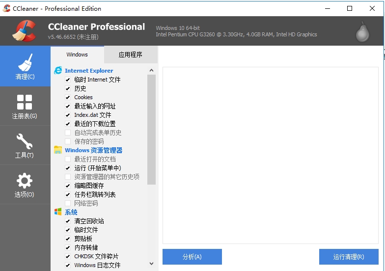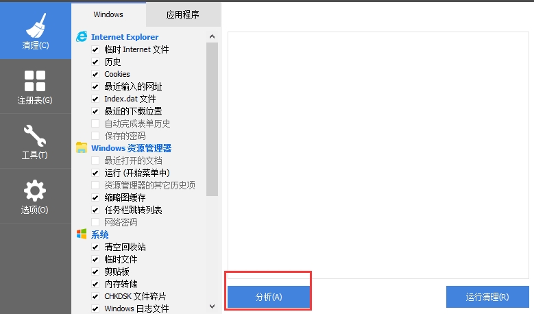 2、如果您要清理文件,您可以点击左侧工具栏中的【清理】,然后点击右侧界面中的【分析】按钮。