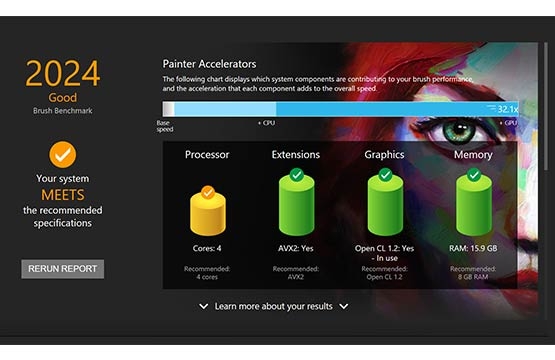 画家将跟上每一笔画,为您节省宝贵的时间!Brush Accelerator™实用程序为您的系统打分并自动应用最佳Painter性能设置,允许GPU和CPU确保Painter能够以闪电般的速度移动。受益于奖励功能,可以告诉您如何战略性地升级系统以进一步提高Painter的性能。