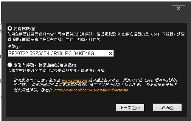 6、选择“我有序号”,并填写下面的注册信息输入序列号PF20T22-5SZ56E4-3RY8LPC-34KE49G,或者将其留空并选择您想要试用该产品,点击下一步