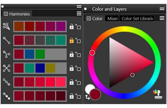 6 套全新色彩协调可以储存为色彩集。此外,Painter 中通用的色彩选取器增强功能,让您不费吹灰之力就能找到所需色彩。