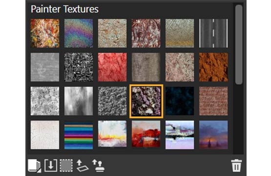 从素材库选取含纸张材质等不同画布媒材。您可使用不同的媒材类型,调整、汇入或创造个人材质,亦可覆盖或显示画布材质。