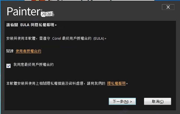 2、安装前先断开网络,离线安装,双击Corel Painter 2020.exe运行,选择路径并勾选我接受许可证协议条款,点击安装