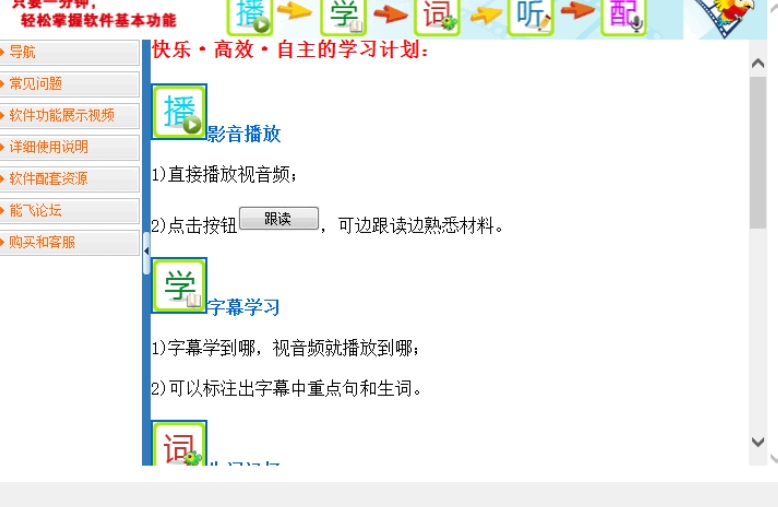 6、下图是能飞英语视听软件的帮助功能,可以在这里了解软件的功能以及使用的步骤