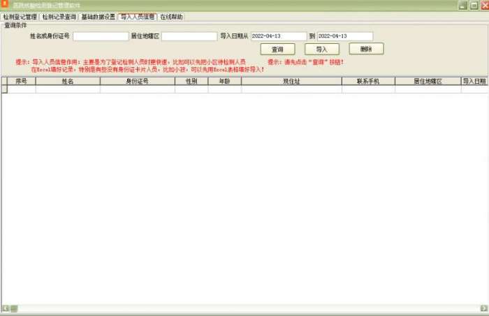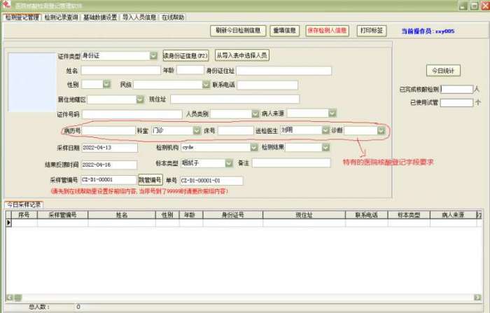 登记人员信息更准确,支持登记好的人员记录批量导出到EXCEL和批量打印功能,特有的医院字段:病历号、科室、床号、送检医生、诊断管理功能使用得本软件更适合医院核酸登记使用,软件成熟稳定自2020年以来就很多医院一直在使用的。是核酸检测登记的好帮手。