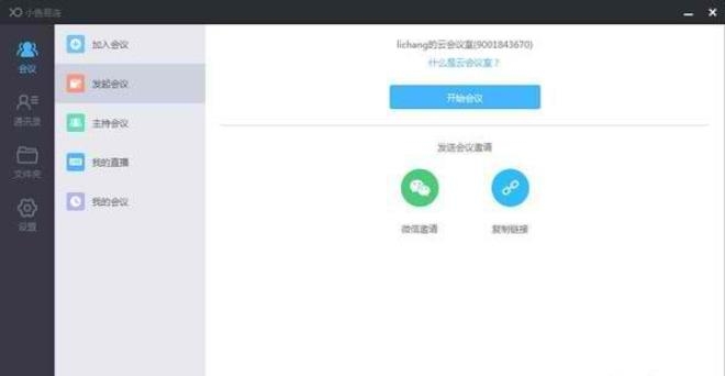 用户可通过PC客户端发起自己的会议,点击“发起会议”,右侧页面将显示用户的云会议号码,点击“开始会议”,即进入云会议室开始视频会议。