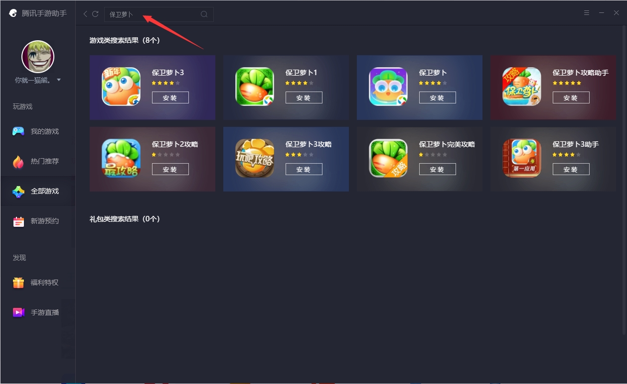 2、选择任意一种方式登录后,在腾讯手游助手电脑版左上角的搜索框中搜索想要下载的游戏,比如保卫萝卜,得到搜索结果后直接点击安装即可。