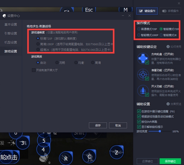 6、键位设置中的操作模式要和游戏中的清晰度完全匹配。(比如选择表情720P,操作模式就选择智能模式720P)
